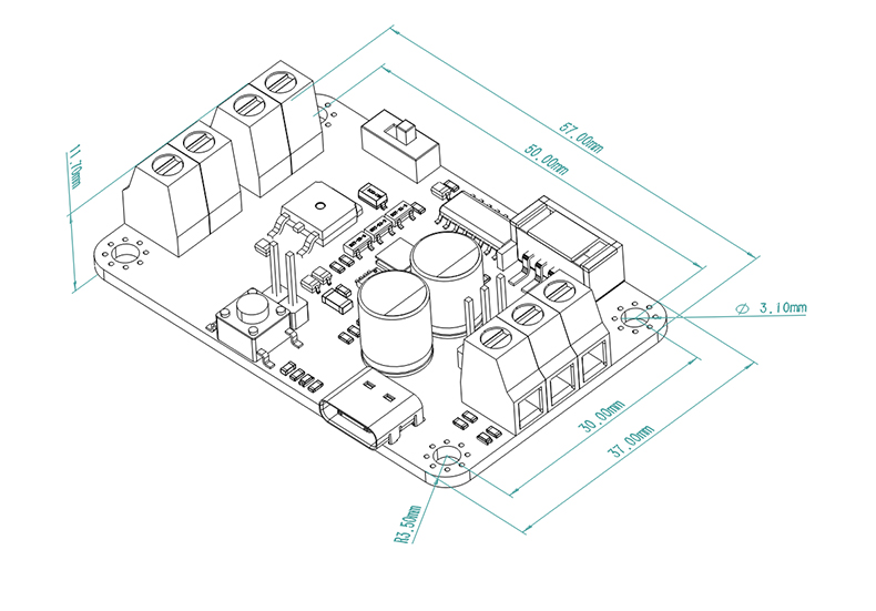 采用大功率MOS管,支持10A大电流输出。能驱动50W的直流电机或者整卷5米灯带。