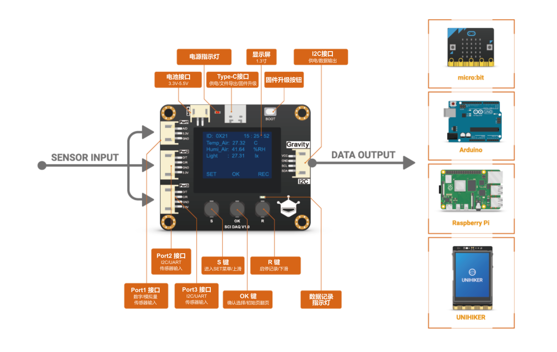 Gravity: SCI采集模块是一款功能强大且高度集成的数据采集模块,具有屏幕显示、传感器自动识别、传感器校准、数据存储、RTC时钟以及数据转换等多功能,让数据采集变得更加便捷和高效。此外,SCI采集模块支持多种供电方式,可通过I2C接口输出传感器采集的物理量数据,兼容Arduino、micro:bit、掌控板、行空板、树莓派等硬件平台。